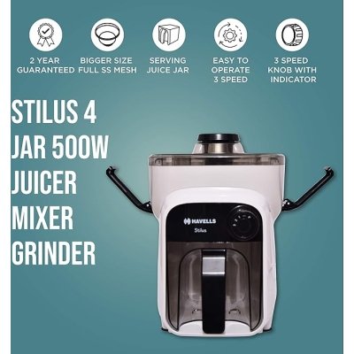 Havells Stilus 500 Watt Juicer Mixer Grinder 4 Jar With 3 Speed Led Indication,Big Size Pulp Container,Juicer Jar With Fruit Filter&Sliding Spout,1 Ltr Transparent Serving Jar(White/Black)500 Watt