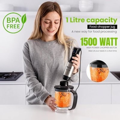 | Included Components | 1 N Gear Box, 1 N Chopper Jug, 1 N SS Stem Assembly, 1 N Multipurpose Jar, 1 N Patoto Masher, 1 N Hand Blender Motor Unit, 1 N Instruction Manual Cum Warranty Card, 1 N SS Whisker, 1 N SS Chopping Blade, 1 N Chopper Lid1 N Gear Box, 1 N Chopper Jug, 1 N SS Stem Assembly, 1 N Multipurpose Jar, 1 N Patoto Masher, 1 N Hand Blender Motor Unit, 1 N In… See more |