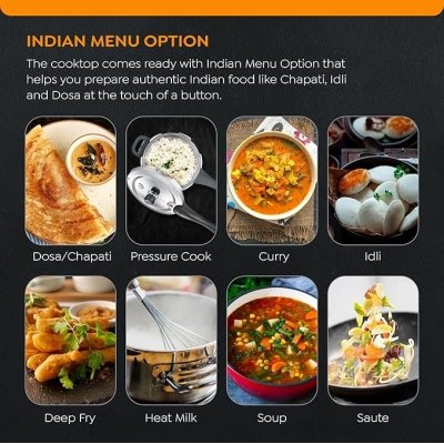 - INDIAN MENU OPTIONS: The cook-top comes ready with Indian Menu Options that help you prepare authentic Indian food like Chapati, Idli and Dosa, at the touch of a button.