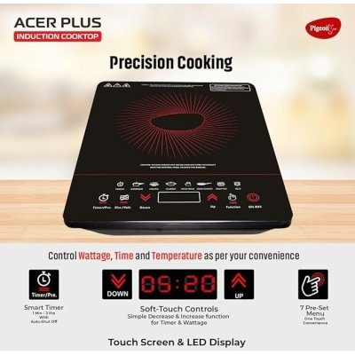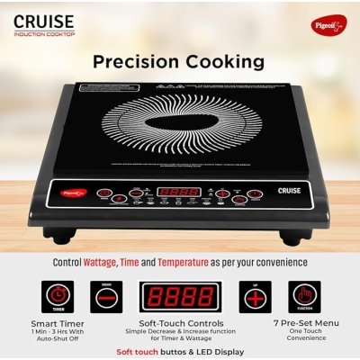 - Pigeon Cruise Induction Cooktop Comes with 7 segments LED display for power and temperature. This Induction Stove comes with high-grade electrical that protects against short circuits. It’s superior top plate cans with-stand very high temperatures, making it very durable;Smart timer for hands free cooking , Cord length : 1.3 meter. Worktop Material:Carbon Steel, Preset timer – auto switch off , Soft push button, Temperature Control: Manual