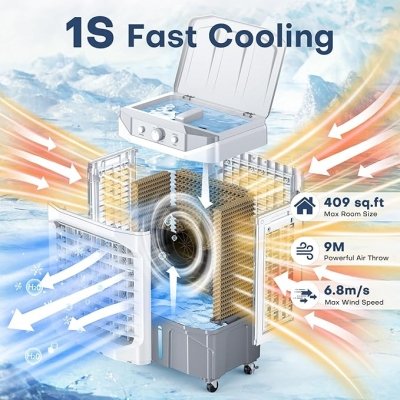 Special Feature Detachable Design for Easy Cleaning, Removable Cooling Pad, Built-In Handle, and 4*360° Wheels for Mobility., 20H Cooling with 20 Liters Ice Chamber and 4 Ice Packs. Knobs Control ensures user-friendly operation, catering to all, including seniors., Enhanced Safety: Waterless Protect System, 1.8m Electric Cord for Flexibility, Leak-Proof Plugs for Extended Lifespan, UL Listed, Safe Bladeless Design., ‎2S Fast Powerful Cooling & Coverage Area: 420sq.ft and Evaporation Capacity: 2L/H, 70° Swing & Utral-Quiet Technology & Cooling Modes., Superior Cooling with AC’s 3-IN-1 Function, 2025 Upgraded Efficient Motor, 3-Speed Settings(Max wind speed: 6.5m/s). See more