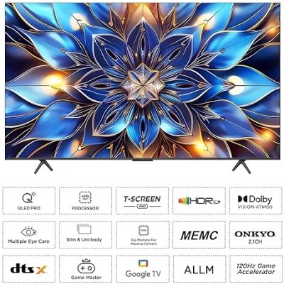 Special Features ‎QLED | Dolby Vision Atoms | HDR 10+ Decoding | Direct Full Array | Pixel Tuning | Depth Enhancer| 120 High Refresh Rate | 4K AI Upscaler | Game Mode Plus | AI Sports Mode | Filmmaker Mode | Far Field Voice Control | VRR and ALLM | MEMC | HLG | Dolby Digital | Google Assistant | Screen mirroring | Multiple picture modes supported | Supported Apps : Netflix, Youtube, Prime Video, Disney+Hotstar, SonyLiv, Hungama, JioCinema, Zee5, Eros Now