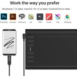 • Compatibility – HUION graphics tablet supports Windows 7 or later/ macOS 10.11 or later/ Android 6.0 or later/ Linux (Ubuntu). You can easily connect your phone to the art tablet via the OTG connector(Only one-Type C port); H1060P supports various mainstream design and drawing software, including PS, SAI, AI, CDR, etc.
