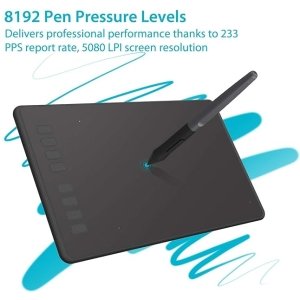 • Active Area: 8.7×5.4 inch working area provides the user with enough space to work. Dimensions:320.8 x 188.8 x 8mm, the tablet can be easily for carrying. What’s in the box: Pen Tablet, Battery-free Pen, Micro USB Cable, USB-C Adapter, Pen Holder, Pen Nib x 8, Quick Start Guide. HUION drawing tablets are also very practical gift option.