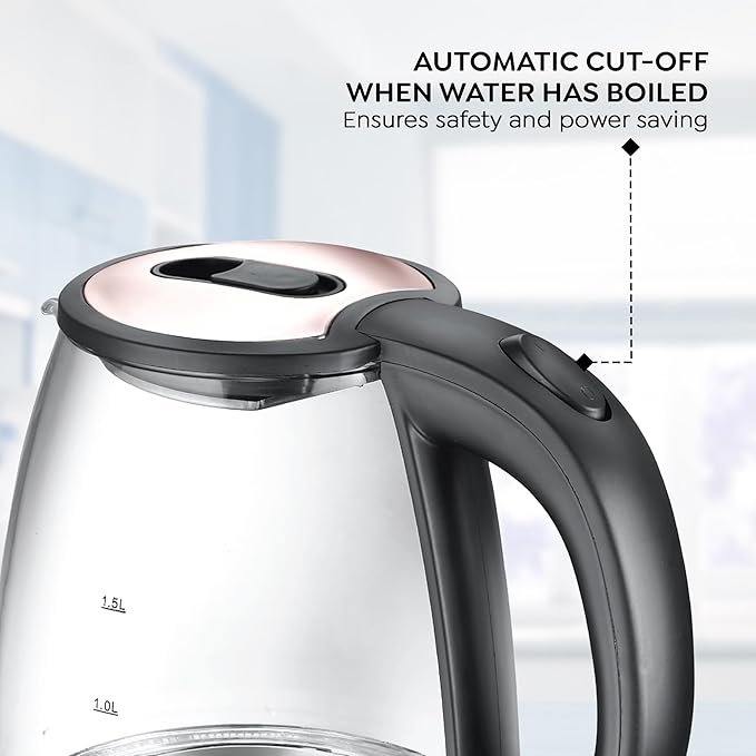 • AUTOMATIC POWER CUT-OFF & DRYHEAT PROTECTION Automatically cuts off power to prevent overheating and ensures safety if the kettle runs out of water or is accidentally operated empty.