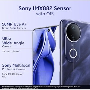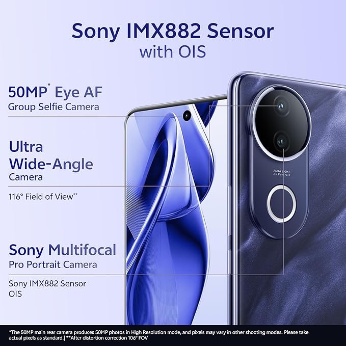 • Rear Camera: Main Camera: 50 MP Auto Focus camera with f/1.79 aperture, , Sony IMX882 Sensor with Ultra-Stable OIS (Optical Image Stabilization) & 2.8 times more light intake to easily capture night scenes (compared to Non-OIS) | India’s Exclusive Wedding Portrait Studio: combination of Wedding-Style Portrait with 3 LUTs & Film Camera Mode | Film Camera Mode: Multiple LUTs combined with multiple frames to create unique compositions | 4K video resolution | 8MP rear wide angle camera with f/2.2 aperture | V50e’s Aura Light intelligently adjust the lighting colour temperature as per ambient conditions | Front Camera: 50MP Eye-AF Group Selfie Camera, aperture f/2.0 | Eye-AF improves detection