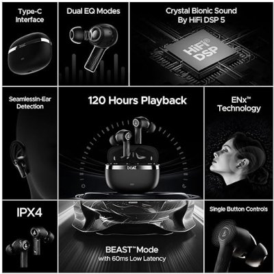 - Crystal Bionic Sound with Dual Modes- These true wireless earbuds have Crystal Bionic Sound powered by Hifi DSP 5 which support dual eq modes: boAt Signature Sound and boAt Balanced Sound