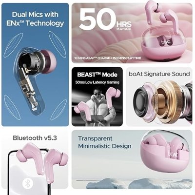 boAt Airdopes 311 Pro, 50H Battery, Fast Charge, Dual Mics ENx Tech, Transparent LID, Low Latency, IPX4, IWP Tech, BT v5.3, Wireless TWS in Ear Earbuds with mic (Lavender Rush)